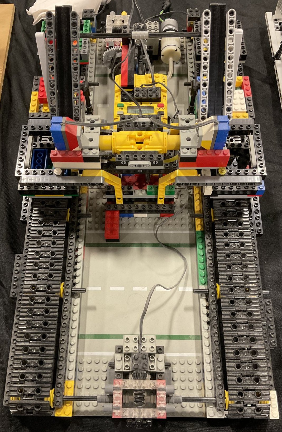 A machine that sorts six sets of 2x4 colored bricks into their respective bins by comparing their amount of reflected light against known values.